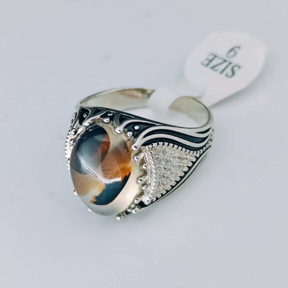خاتم فضه رجالي عقيق مرصع بفصوص الزركون