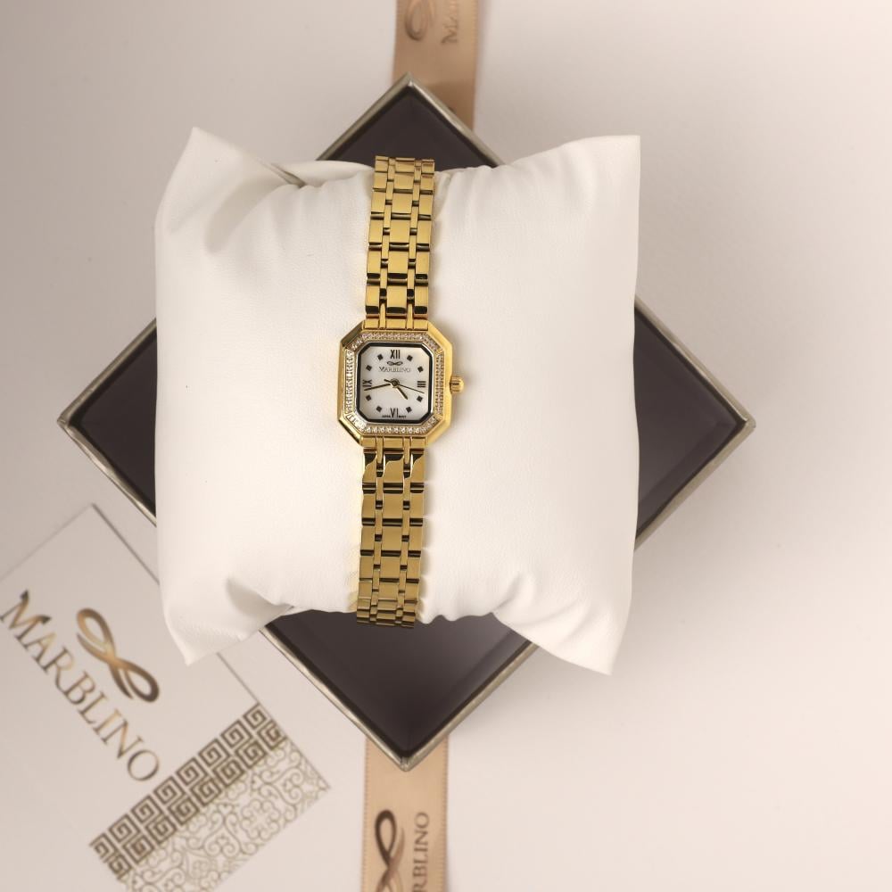 ساعة نسائية من ماركة ماربلينو، ساعة نسائية ترمز للجمال و الأناقة، ساعة نسائية بتصميم لا يقاوم من MARBLINO ، ساعة نسائية بتفاصيل لامثيل لها سير ستانلس ستيل مميز باللون الذهبي وإطار بشكل مربع مرصع بفصوص الزيركون اللامعة ساعة ستضيف ليدك رونق خاص وطلة لا تنسى، تأتيك الساعة بتغليف و بكج أنيق يشمل على كيس بشعار ماربلينو الذهبي و علبة على شكل مربع فاخرة لحفظ الساعة، ساعة صنعت من ماربلينو خصيصًا لك لتلائم ذوقك الرفيع، ساعة ستكون بلا شك أفخم أختيار لديك لأمسية و سهرة سعيدة، أبرزي جمالك مع هذه الساعة الفريدة و تألقي بطلة لا تنسى.